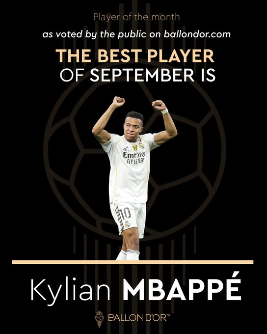 Giải Quả cầu vàng đã chính thức công bố vào ngày 31 tháng 10 rằngMbappe đã được chọn là Cầu thủ Quả cầu vàng của tháng vào tháng 9 sau khi người hâm mộ bình chọn.